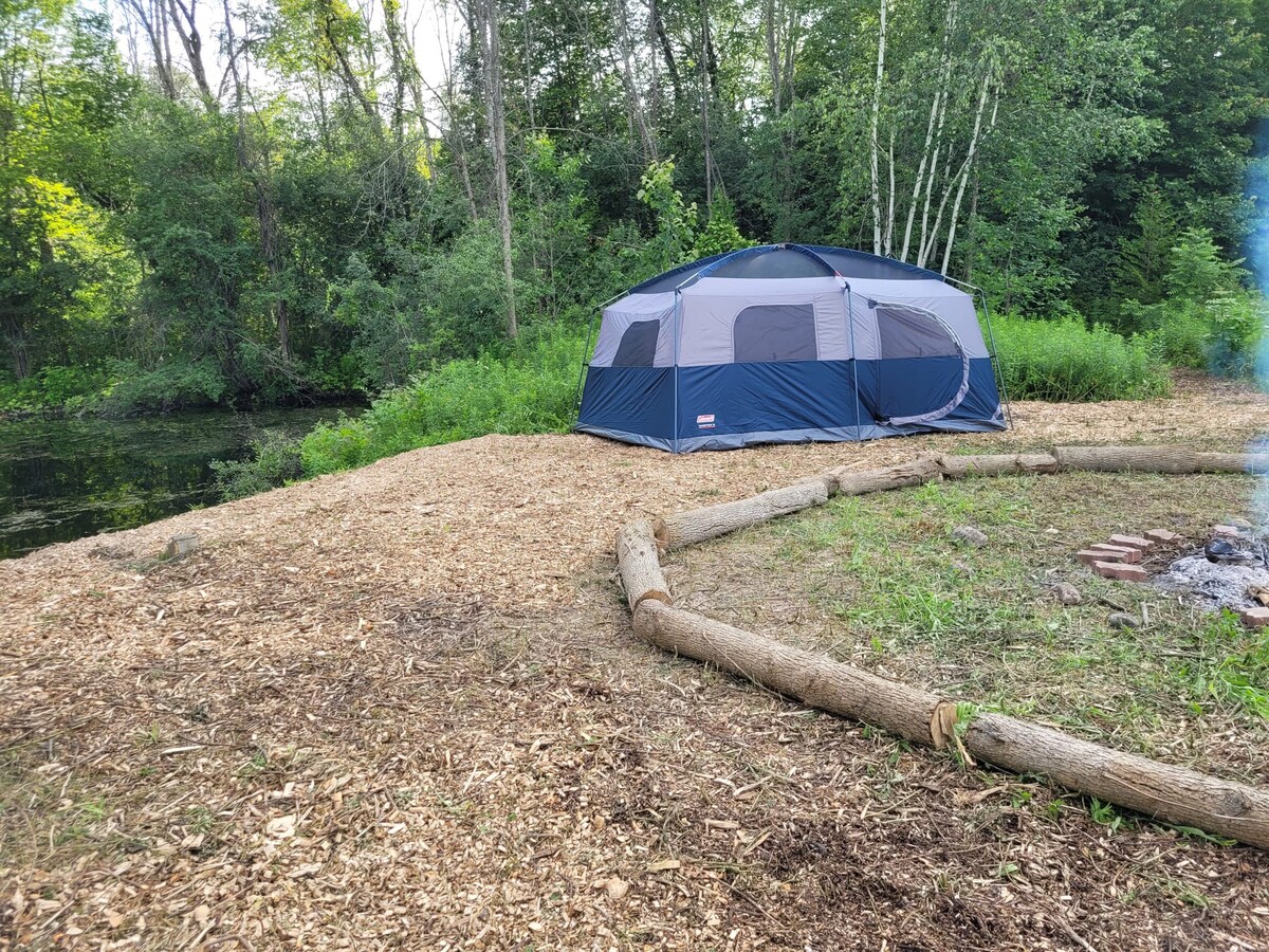 Reconnect with nature at this unforgettable escape. Brand new 9 person tent with room divider and 3 airbeds. Situated next to a beautiful pond, and next to trail! See wildlife, from beavers, frogs, turtles, blue jays and more. 30 acre forest to test your sense of navigation or use the manicured trails. New portable shower with privacy tent along with dedicated portable bathroom tent. New sink and hand wash station. Fireplace pit nearby! Come visit for your next safe camping getaway.