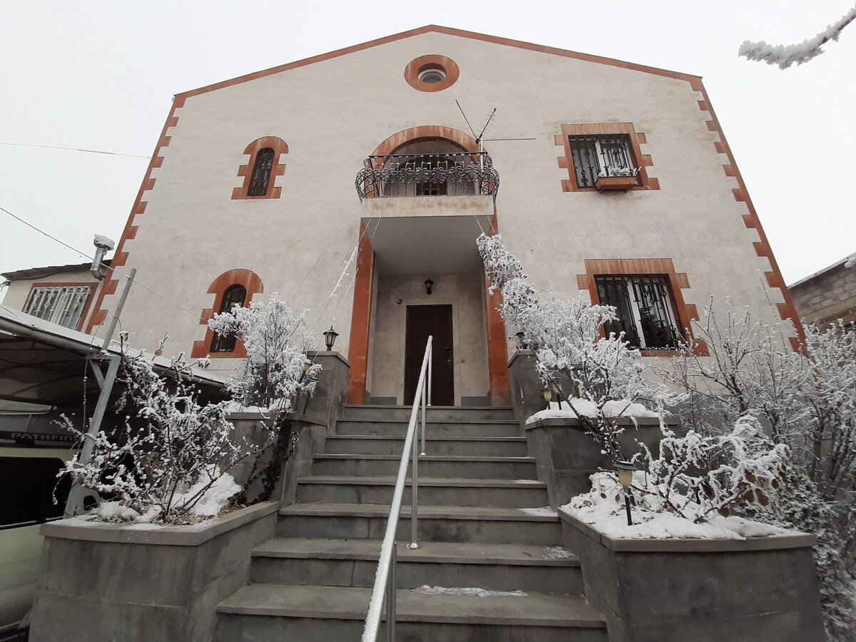 Gran casa de 2 plantas con vistas al templo Garni y al panorama de la montaña, rodeada de un huerto de frutas (manzanas, peras, cerezas, avellanas, etc.). La casa está decorada con obras del artista armenio Martirosyan. Tres dormitorios, cocina-sala de estar, galería, dos baños, 4 balcones. Ofrecemos a nuestros huéspedes cocina armenia (desayunos, almuerzos y cenas). También realizamos una clase magistral de pintura de platos en plantillas preparadas. Hay un lugar para cocinar barbacoa.
