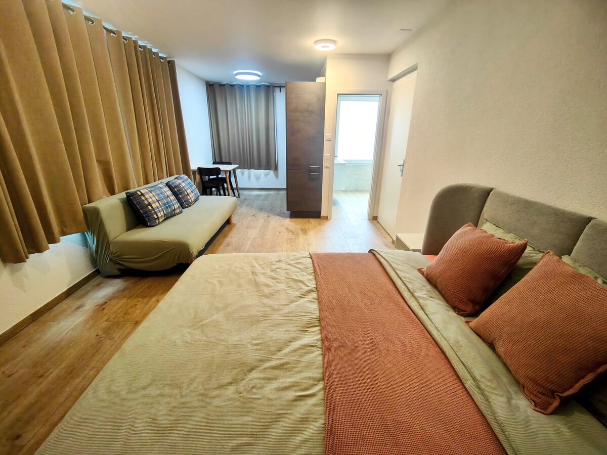 Das Studio (ca. 30m2, ein grosser Raum) mit grosser Terasse mit einer atemberaubenden Aussicht auf die Berge, liegt im Erdgeschoss unseres Hauses. Es ist durch einen eigenen Zugang erreichbar. Das Studio ist einfach, vollständig und zweckmässig ausgerüstet und verfügt über eine offene Küche, ein Badezimmer, sowie Schlafmöglichkeiten für 2-4 Personen (Doppelbett und Schlafsofa für max 2 Personen). Grosse Fenster ermöglichen es, auch im Studio das herrliche Panorama zu geniessen.