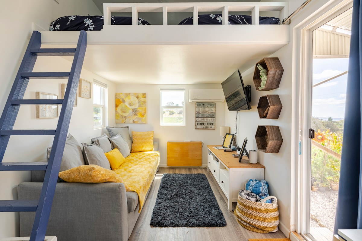 Morey de Prieto Surf Ranch: Reserve su estadía en esta nueva casita de dos dormitorios/un baño de 650 sq. ft. cuadrados con capacidad para 6 adultos. Cocina con muchas comodidades que incluyen una estufa eléctrica GE, refrigerador, microondas y freidora, olla arrocera, batidora Kitchenaid, batidora para bebidas, fregadero con bandejas de preparación, accesorios para grifos Moen, hermosa ducha, cafetera Krups, 50” TV, WiFi, NetFlix, vista a la montaña, espacio de trabajo y sofá cama.