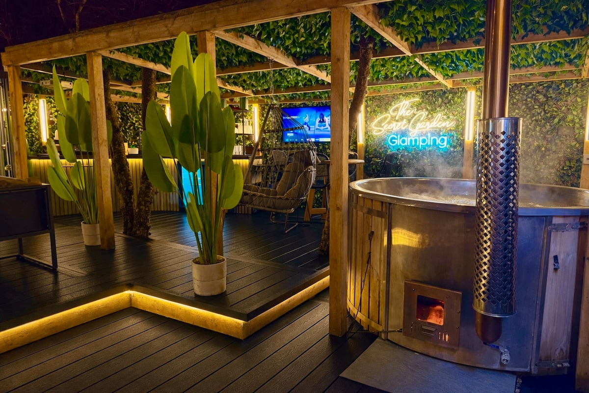 Te damos la bienvenida a The Oasis, una joya escondida dentro de nuestro encantador bosque. Esta unidad se mezcla a la perfección con sus alrededores, ofreciendo un refugio tranquilo completo con todas las lujosas comodidades que esperas de The Secret Garden Glamping. Sumérgete en la mejor experiencia al aire libre con nuestro increíble jacuzzi de leña para 6 personas, zona completa de entretenimiento al aire libre, que incluye un bar e instalaciones de cocina al aire libre, y un cine para noches de cine inolvidables bajo las estrellas.