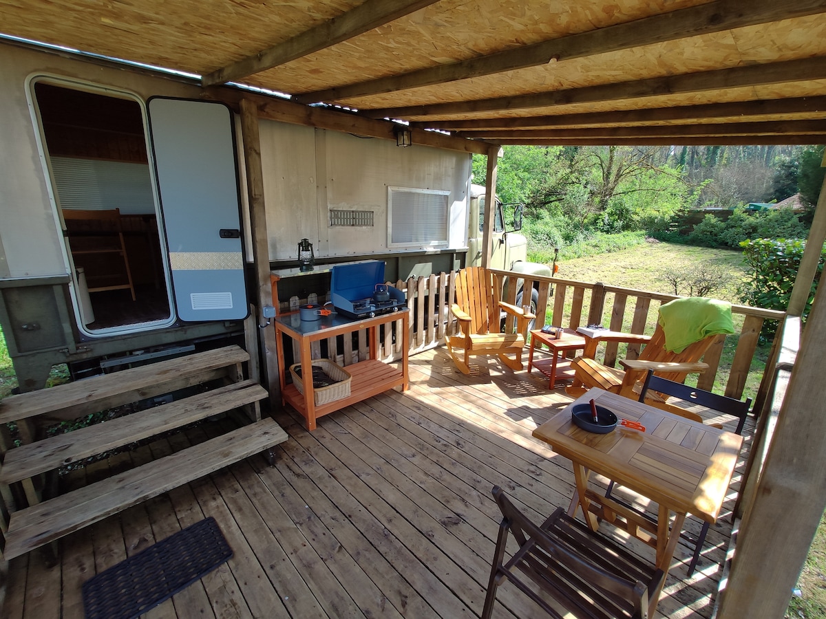 Amplia caravana vintage inmersa en un jardín de bosque de permacultura de 3000 m2: ¡rústica pero cómoda! La naturaleza, la paz y el silencio reinan aquí. Es una ermita, un lugar de renovación: desde 1999, hemos invertido mucho cuidado y amor en el lugar. Solo los amantes de la naturaleza y el bienestar lo apreciarán. No es una habitación de hotel ni un palacio. Ciclovías cercanas ( a 3 minutos ) Bosque contiguo. El lago de Mimizan está a 6 km. Océano: 7 km. En bicicleta: 25 min.