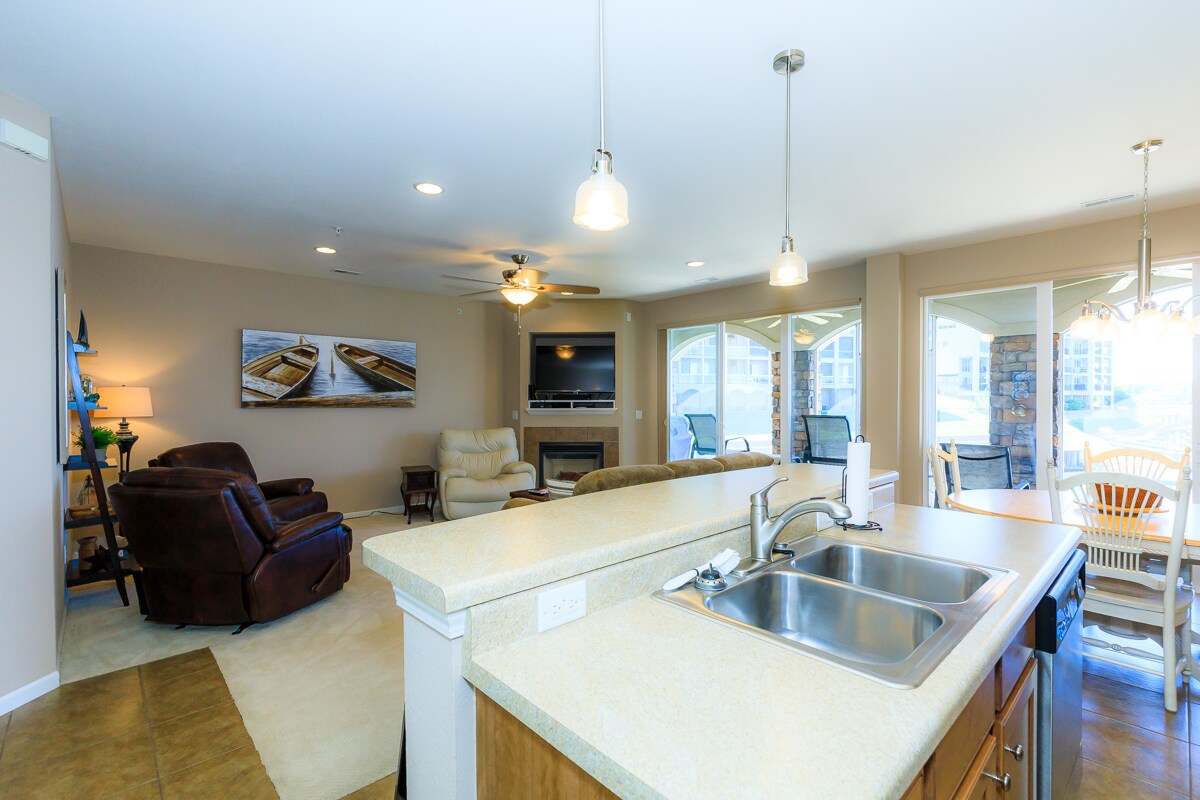 Te damos la bienvenida a Blue Breeze. Este condominio de 3 dormitorios y 2 baños tiene capacidad para ocho personas y ha sido recientemente actualizado en todas partes. Es una unidad en la planta superior con vistas impresionantes al lago. Ubicado en el marcador de 19 millas en Osage Beach, justo enfrente del popular Dog Days Bar and Grill.
