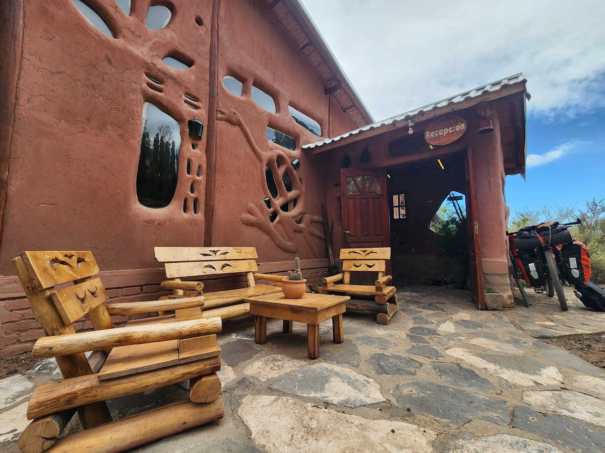 Estamos muy cerca de la terminal de ómnibus y a 8 cuadras de la Ruta 40 y el centro. Es un lugar tranquilo, con entrada independiente. Hay un patio para guardar el vehículo y pasar tiempo al aire libre. A pasos de un parque y un minimarket. Tiene de todo: heladera, horno eléctrico, anafe, cafetera, pava eléctrica, utensilios y condimentos para cocinar, secador de pelo, smart TV, sábanas y toallas, etc. Baño totalmente equipado. Además, te damos la información turística que necesites.