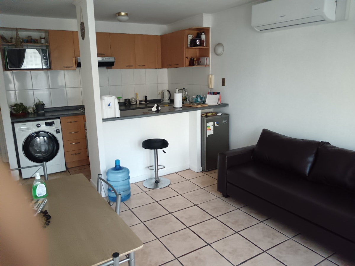 Moderno y acogedor departamento con aire acondicionado en el corazón de Santiago. A pasos del metro y del Centro Histórico, rodeado de museos, mercados y restaurantes. Cama king, cocina equipada, balcón y wifi rápido, ideal para viajes o estadías largas. Edificio seguro con conserje 24/7. Atención personalizada, check-in flexible y recomendaciones locales para que disfrutes la ciudad como un residente, con comodidad y tranquilidad.