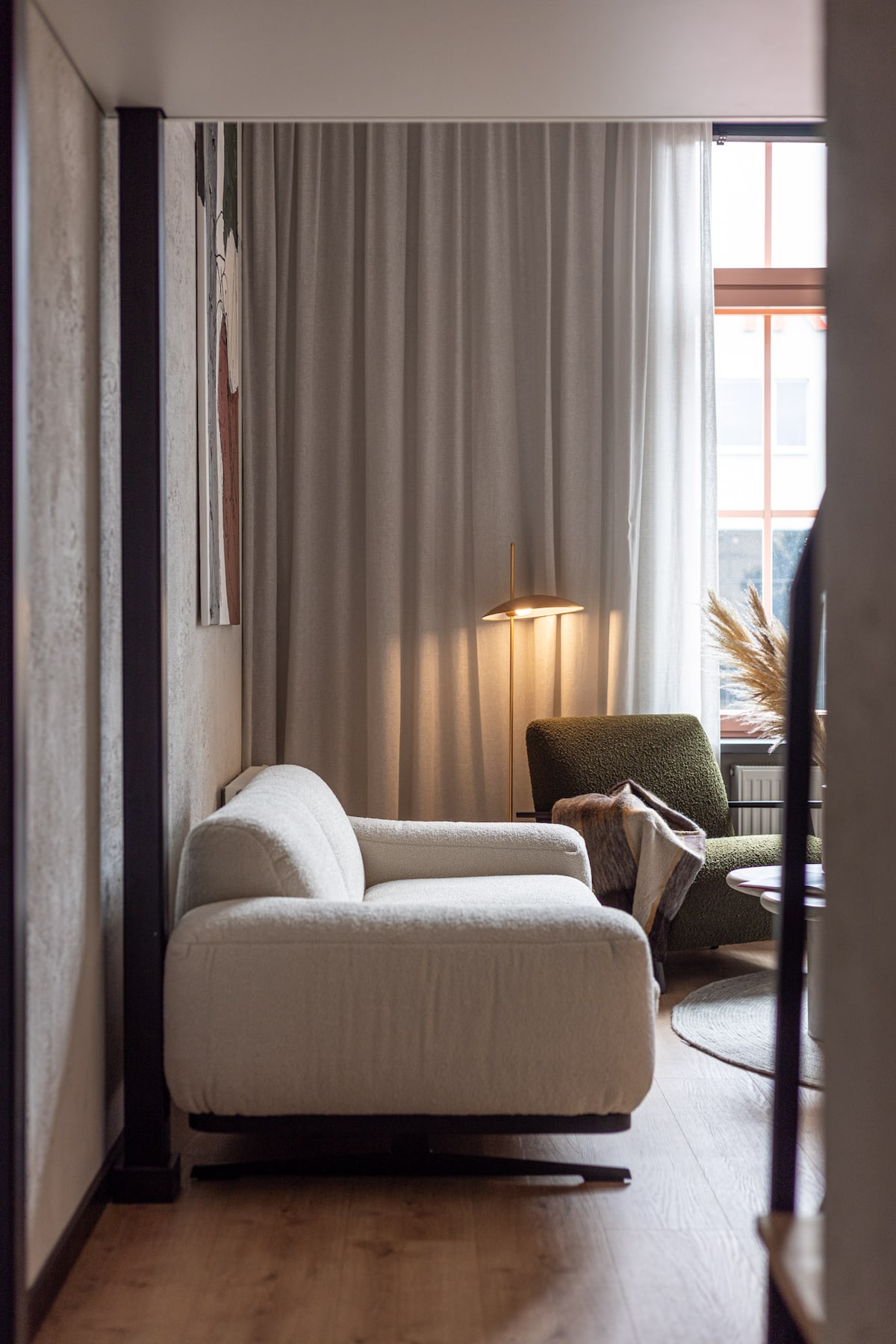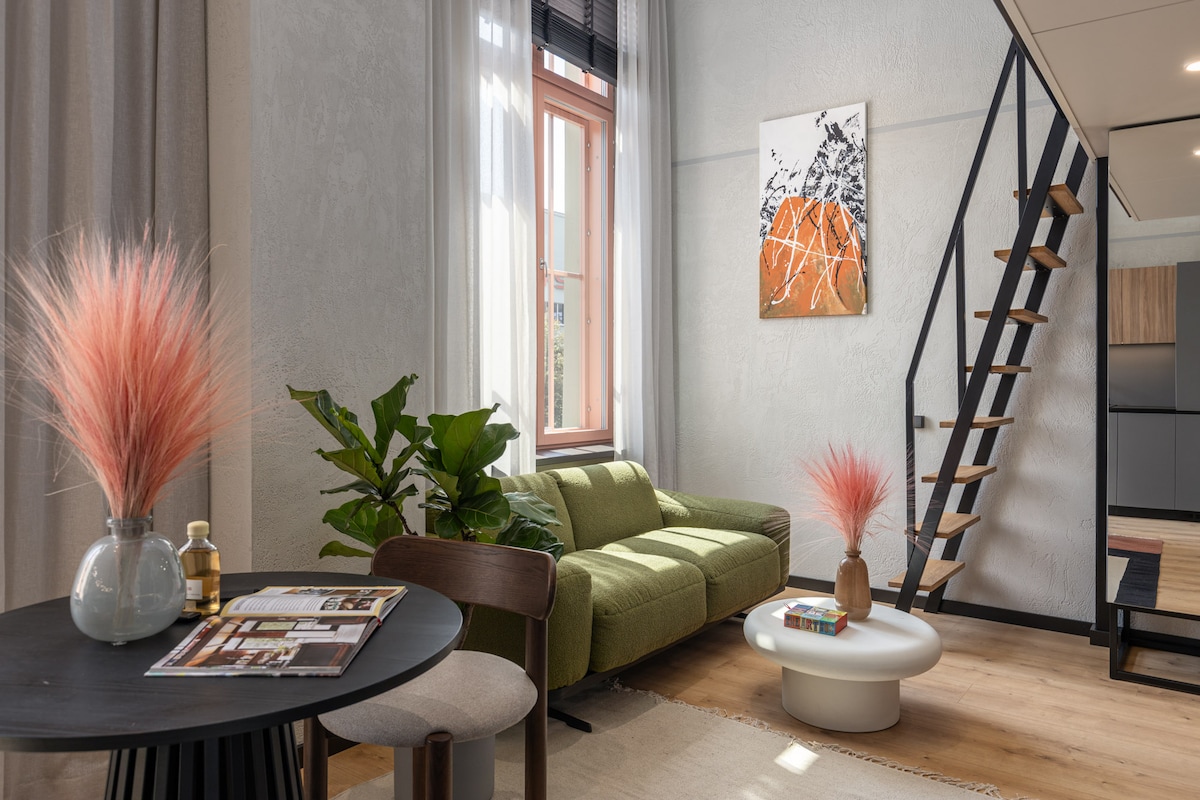 A cozy design loft in the heart of Liepāja Old Town — perfect for a relaxing seaside getaway or a romantic weekend escape. Warm evening light, exposed brick walls, and a calm, stylish atmosphere make this a place to slow down and unwind.