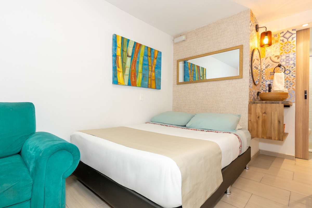 Let yourself be amazed by our cozy and visually striking space! Located in a peaceful, walkable neighborhood, Amanda is the perfect home base for your stay in Medellín. With high-speed internet, it’s ideal for remote work. Just one block from a main avenue, you’ll have easy access to public transportation, plus supermarkets and restaurants nearby. A warm and stylish stay awaits you!
