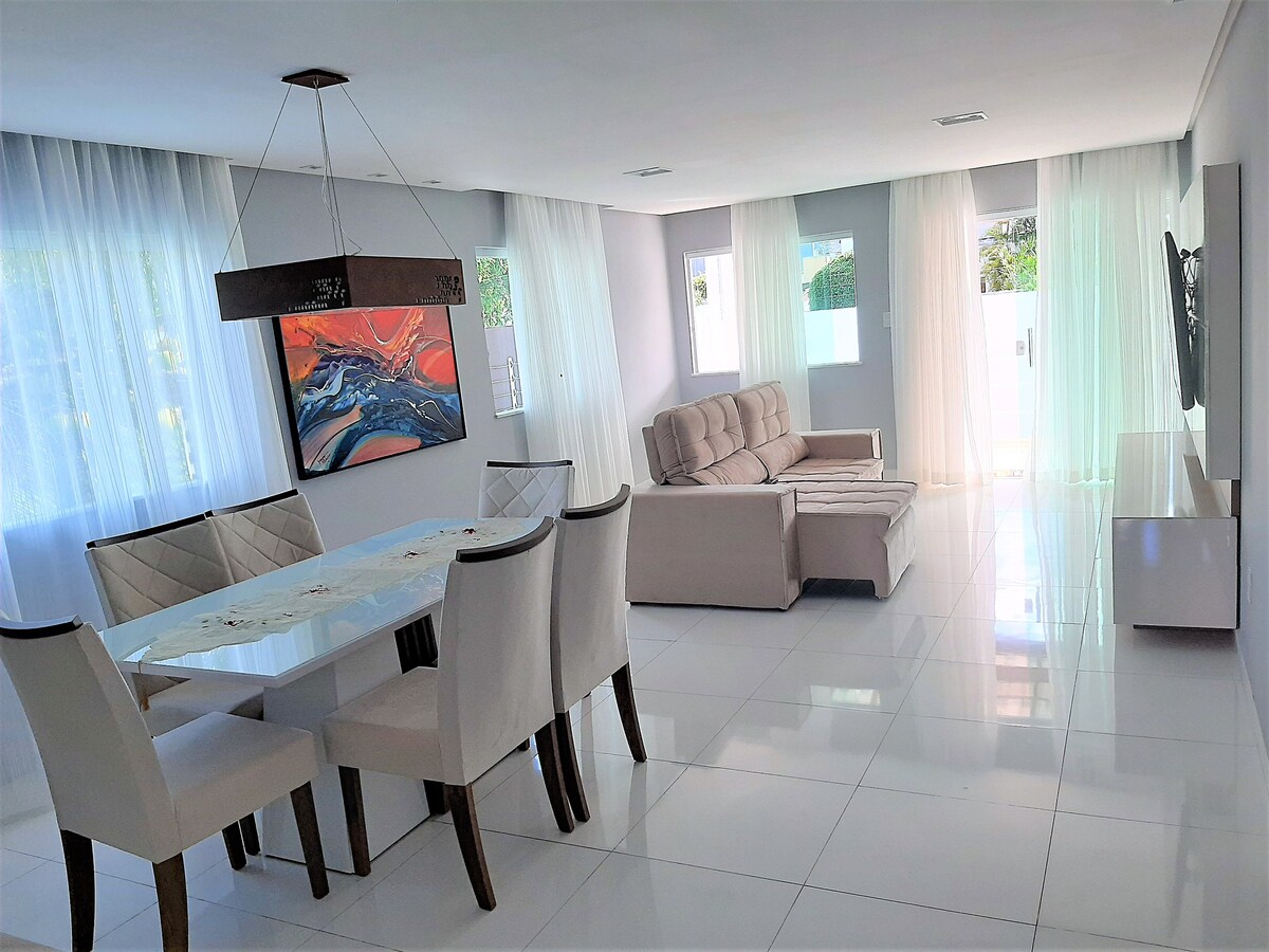 Casa con 4 dormitorios (todos con aire acondicionado) y 3 baños, a 750 m de la playa de Ipitanga y cerca de las playas de Stella Maris y Flamengo. Cerca del aeropuerto, Parque Bahía Shopping, Unime College, Bahia Sports Arena, en Lauro de Freitas, Karting Track, SENAI, etc. Wifi, TV, refrigerador, purificador de agua, estufa, freidora de aire, cerradura electrónica, valla eléctrica, alarmas, área gourmet, etc. También es ideal para alojar a los empleados de la empresa, ya que hay dos escritorios personalizados.