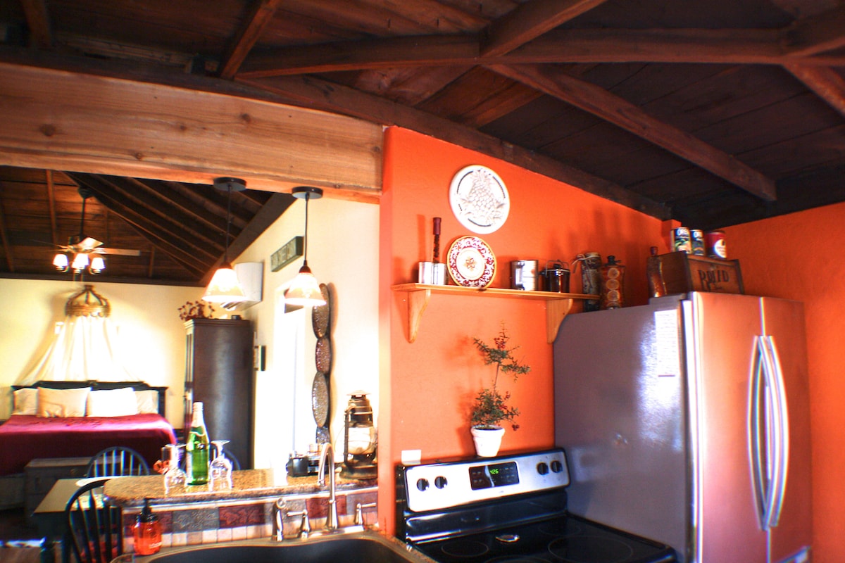 Esta cabaña es rústica pero elegante, pared interior de roca en la cocina con fregadero, encimeras de carnicero y electrodomésticos de acero inoxidable. Hay una gran chimenea de madera y roca, suelos de hormigón teñido y una bañera profunda en el baño principal. La cabaña tiene un dormitorio y baño en la planta baja y dormitorio y baño en la planta superior. Cuenta con un jacuzzi de 4 plazas en un patio privado cubierto. Eagles Nest se encuentra en las estribaciones de las montañas Wichita, lo que le da esa increíble «sensación de cabaña». Eagles Nest es un hogar lejos de casa.
