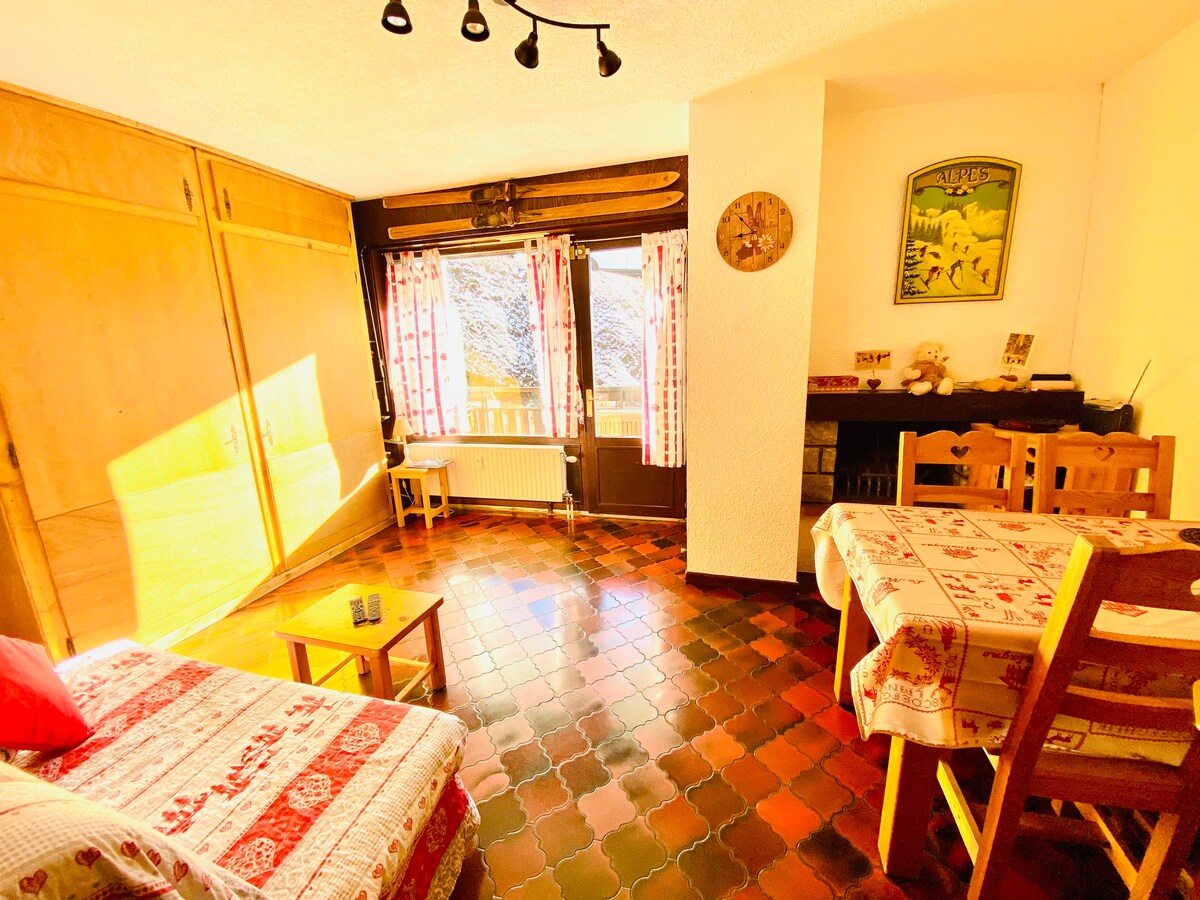 Simplifíquese la vida en este alojamiento tranquilo y céntrico. Todas las comodidades están a poca distancia. Capacidad para 6 personas, con su altillo y su baño, zona de cabina en la entrada con 2 literas y un sofá cama en el salón. Cuarto de baño y cocina equipada abierta. Disfrute de la chimenea o de las vistas desde el balcón orientado al este. Pistas de esquí de fondo y pista a menos de 15 minutos a pie. Parada de autobús de esquí frente a la vivienda. Bienvenido a nuestra casa.
