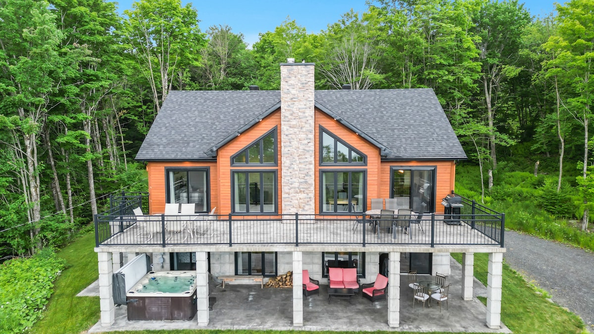 CITQ303008 Superbe chalet neuf (2020)tres belle vue sur le Lac Nicolet, tres chaleureux .5 chambres à coucher, pouvant coucher 10 personnes, Spa, table de Babyfoot ,air hockey, Wii ,tapis roulant, vélo stationnaire, Wi-Fi ,TV fibre optique,2 télé (65-60pouces),BBQ, Grande cuisine avec ilot en marbre. Deux frigo .Deux salle de bain, premiere avec douche et bain autoportant, deuxième avec douche en coin ,deux terrasses de 16x 44 pieds en béton. Pres du quai municipal(400mètres)pour bateau ou plage