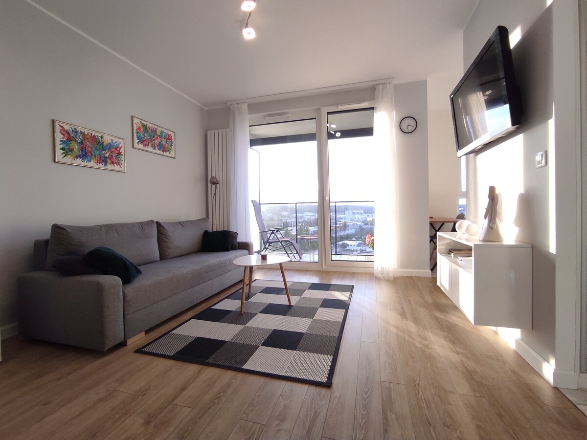Le invitamos a un apartamento nuevo y elegante en el centro de Gdynia. El apartamento está situado en la planta catorce, desde donde se puede disfrutar de una hermosa vista de la ciudad. El espacioso apartamento de 59 metros cuadrados consta de un salón con cocina americana, dos dormitorios, un cómodo baño con una gran ducha, un vestidor y una lavandería. El apartamento está totalmente equipado, ideal tanto para estancias cortas como largas.
