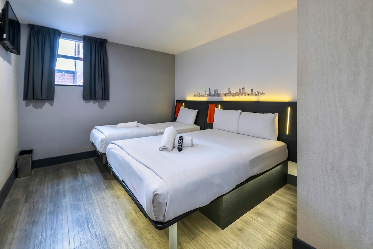 Esta habitación sencilla con una cama doble y dos camas individuales es compacta, está diseñada de forma inteligente y es justo lo que necesitas para una noche de sueño sólido. Se trata de conseguir una gran relación calidad-precio y mantener las cosas verdes con nuestro enfoque simple y bajo en carbono. La habitación ofrece aire acondicionado, TV, wifi gratuito y baño privado para tu comodidad. Se requiere un depósito reembolsable de 50 £ de tamaño de la habitación. Se requiere un depósito reembolsable de £ 50 en el momento del registro.