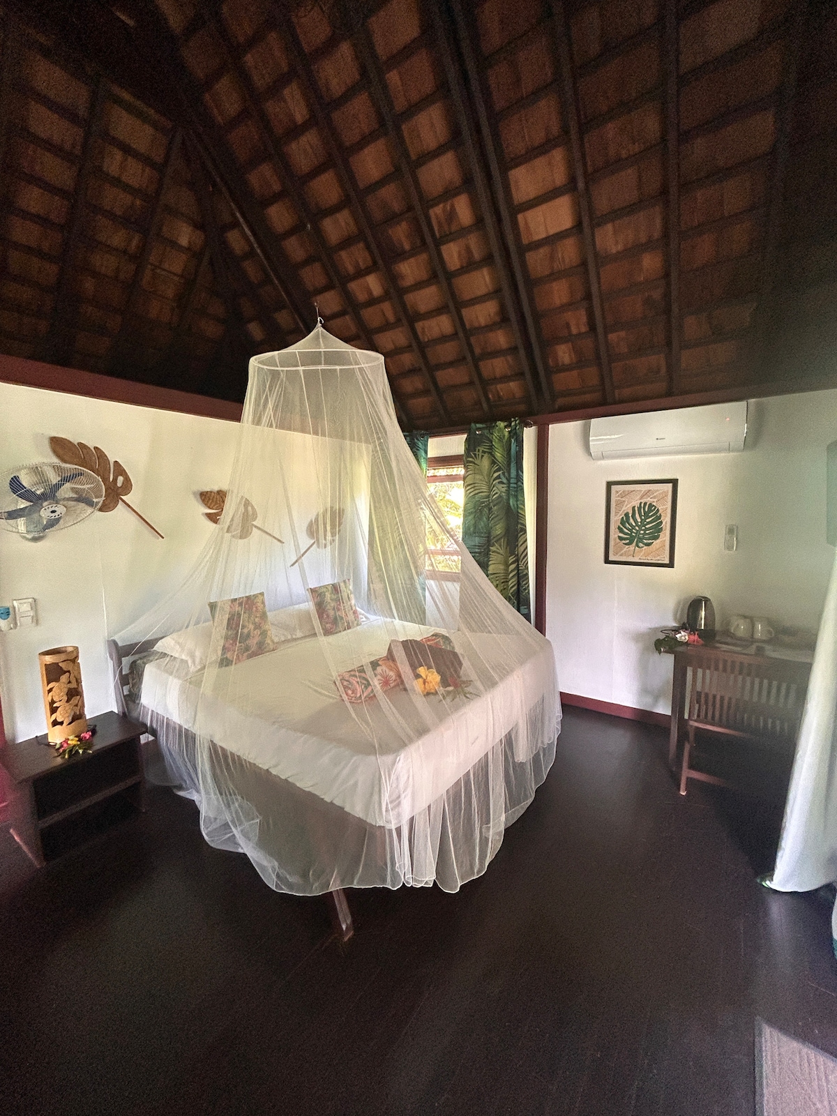 El bungalow Bali Hai tiene una ubicación ideal en una carretera privada a solo 200 metros de una de las mejores playas de Huahine y a solo 10 minutos a pie de la tarifa principal de la ciudad. El bungalow cuenta con una cama tamaño queen, cocina totalmente equipada, ducha al aire libre, ventiladores de techo, ventanas y puertas protegidas. En un jardín tropical, los huéspedes pueden disfrutar de una comida en la mesa del comedor, relajarse en la hamaca o practicar yoga en la terraza con privacidad; los terrenos están completamente vallados. ¡Wifi gratuito, bicicletas y recogida en el aeropuerto!