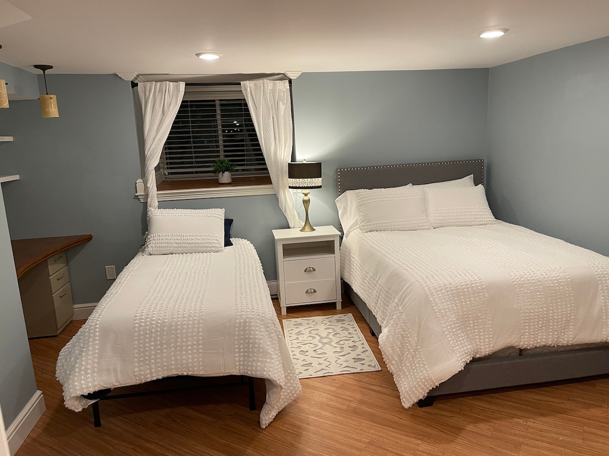 800ft² 1-Bedroom, 2-Level Apartment Private Rental @ our 3-Rental Property 1st Floor: —Fully Equipped Granite Kitchen w/Dishwasher + Essentials & Cookware —Living Room w/Queen Sofa Bed + Dining Table 2nd Floor: —Bedroom - Memory Foam Queen Bed —Full Length Mirror —Desk & Chair + Dresser —Bathroom - Shower/Tub Backyard Patio Laundry Room (Basement) Driveway Parking 25 min to Boston 15 min walk to Train 5 min walk to Jack’s Abby Brewery 3 min walk to Park/Playground Deep Cleaned & Sanitized