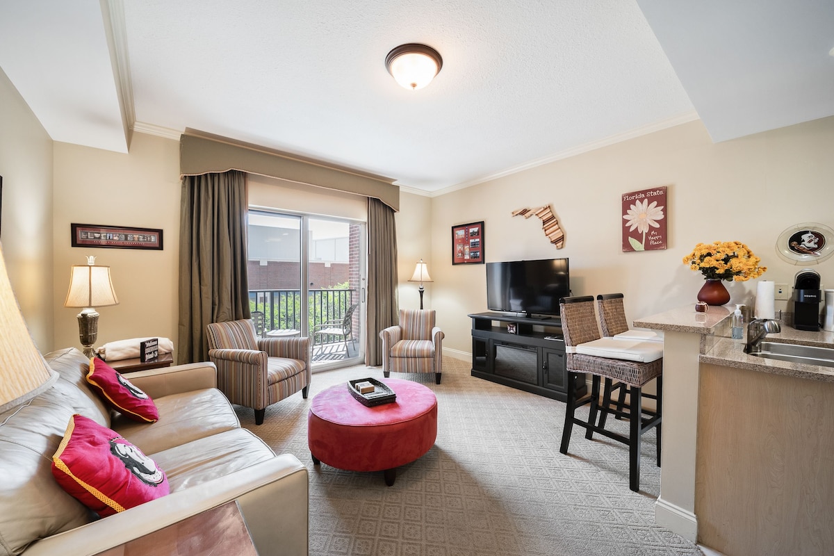 Stay in the heart of Tallahassee with unbeatable walkability to the Florida State Capitol, FSU, restaurants, and nightlife. This spacious studio offers second floor skyline and FSU fountain views from a private balcony, secure parking, and room for up to 3 guests — perfect for game days, business travel, or family getaways.