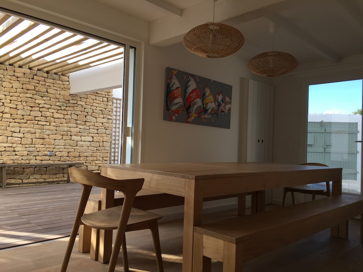 Luxueuse villa d'architecte. Pour des vacances sans voiture, cette propriété d'exception de 275m2, réalisée par un architecte rhétais, est idéalement située à 100 m de l'une des plus belles plages de l'île de Ré. Elle est composée de 5 chambres doubles, 5 salles d'eau, 3 Wc, elle est érigée sur un terrain de 2400m2 avec une vaste piscine privée de (11,5x4m), boulodrome, ping-pong, cuisine et salon d'été, 4 places de parking, recharge électrique pour voiture, thermomix