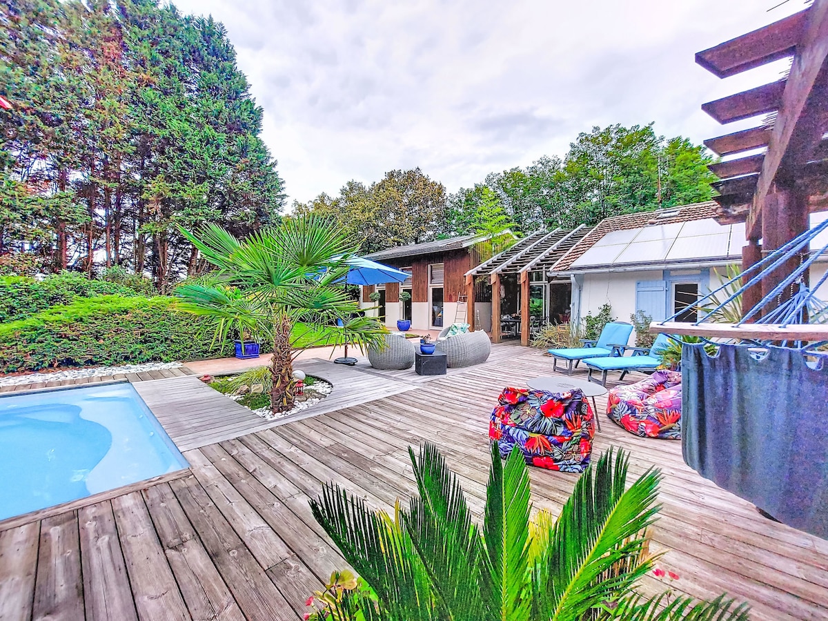 Casa nueva rodeada de bosque al lado del carril bici y las playas de la costa de las Landas Consta de una sala de estar con cocina americana, 3 dormitorios, incluyendo 1 suite principal con baño y aseo, y otro baño y aseo independiente. Fibra óptica 🛜 En el exterior, una piscina orientada al sur de 4 x 8,5 m climatizada de abril a 11 de noviembre con jardín paisajístico y 110 m2 de terraza de madera. Playa y golf de Moliets y Maa a 10 minutos Vieux Boucau a 15 minutos Hossegor a 28 minutos. Biarritz 50 min