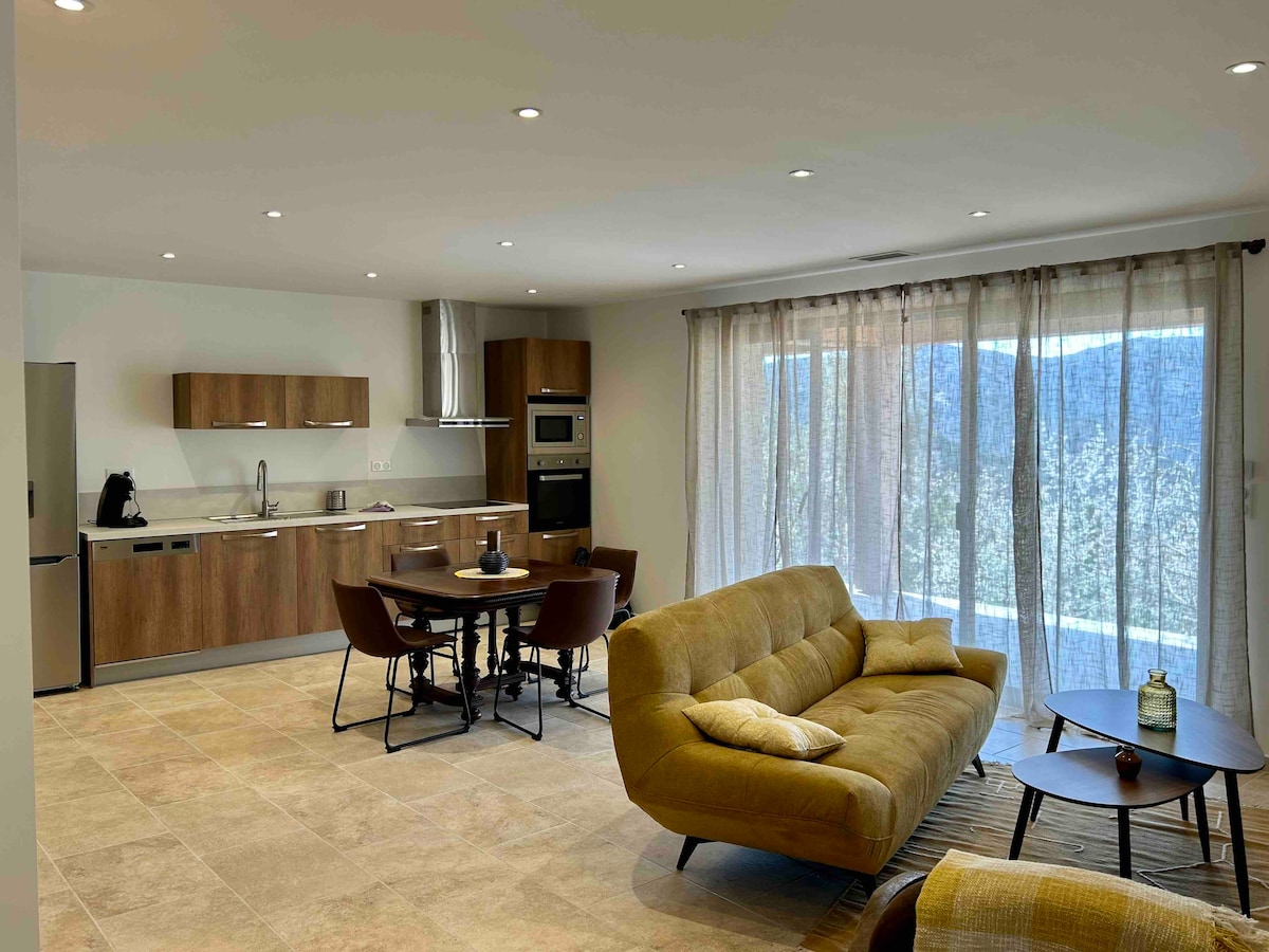 La Bergerie le da la bienvenida en un ambiente cálido y luminoso: un gran salón, una cocina equipada y 2 dormitorios en la planta superior. El cuarto de baño está en la planta baja. Le proporcionamos la ropa de cama y los productos esenciales para el desayuno (té, café, chocolate). Para cocinar, también se proporcionan especias y aceite de oliva. La terraza está rodeada de naturaleza con una suntuosa vista de las montañas. Perfecto para unas vacaciones serenas.