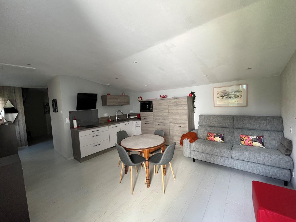 Bonito apartamento de 60 m² reformado con piedras a la vista y chimeneas del siglo XVI. Amistoso, cálido y contemporáneo a la vez con todas las comodidades modernas. Encontrará: cocina equipada abierta a un salón cómodo y espacioso con TV y Wifi. Dormitorio separado con 1 cama de 160, baño con toalla seca. Entrada, estacionamiento y terraza privados. Madera incluida.