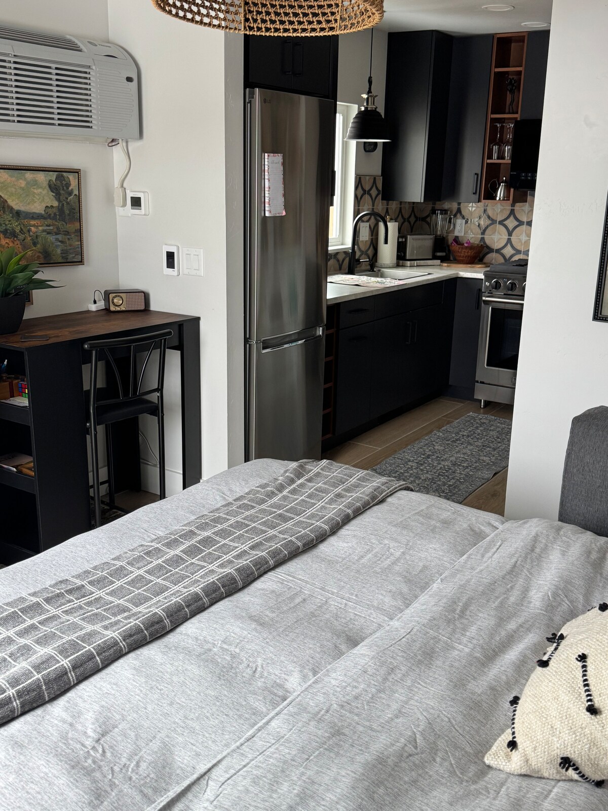 Este lugar único tiene un estilo propio. Estudio bien diseñado con una cama abatible tamaño queen. Acerca del espacio: El espacio está equipado con calefacción por suelo radiante y aire acondicionado para que te sientas cómodo. Es perfecto para una escapada relajante. Este monoambiente tiene una cocina moderna de servicio completo; el baño es moderno y tiene un diseño elegante. Hay un combo de lavadora y secadora en la unidad, junto con una estación de trabajo dedicada para ponerte al día cuando no estés. También hay una unidad de 2 dormitorios que se puede alquilar junto con el estudio.