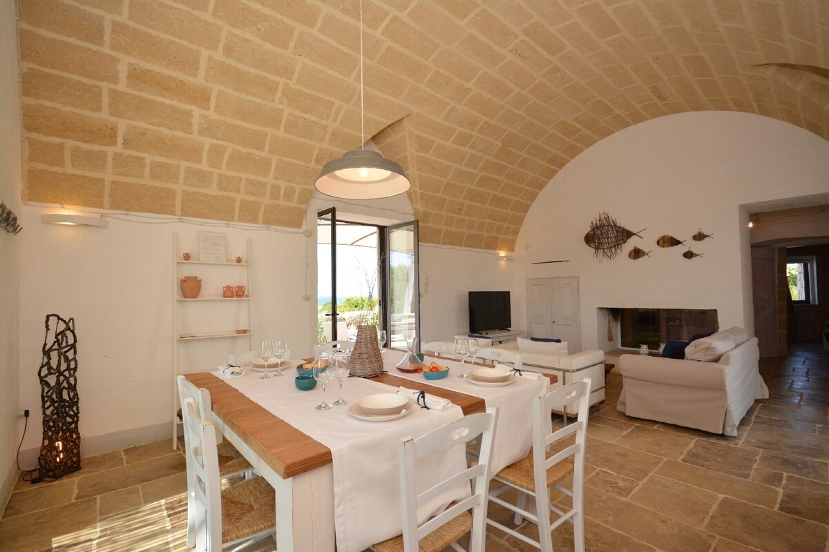 Villa en piedra, con una vista impresionante del mar, caracterizada por amplias terrazas y una piscina frente al mar donde se puede admirar la costa de Salento; rodeada por un gran jardín bien cuidado está conectado con los antiguos caminos de sal (caminos utilizados para transportar sal del mar al interior)excelente para los amantes del senderismo y para descubrir el matorral mediterráneo. La decoración interior es nueva, cómoda y todas las ventanas dan al mar y están equipadas con mosquiteros, WiFi