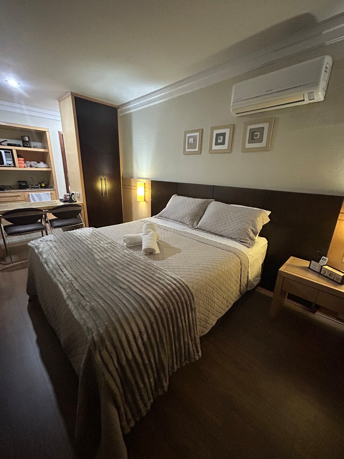 De nada. Este estudio recién inaugurado se preparó con mucho cariño para que te sientas como en casa en Curitiba. Los tonos neutros, la carpintería funcional y la iluminación suave hacen que el ambiente sea ligero y tranquilo. Aquí podés descansar, trabajar tranquilamente y disfrutar de la ciudad con practicidad. La residencia MUV se encuentra en una zona céntrica, con fácil acceso a hospitales, universidades, restaurantes y atracciones locales. Este estudio no tiene garaje, pero hay la opción de estacionamiento de pago en el edificio.