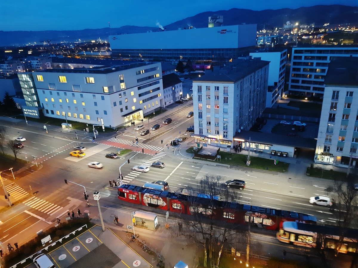 Helles Apartment im 5. Liftstock eines Hochhauses im Stadtgebiet, verkehrsmäßig sehr gut gelegen, öffentliche Verkehrsmittel und Autobahnauffahrt in unmittelbarer Nähe und trotzdem ruhig in der Unterkunft. Gute Infrastruktur vorhanden. Aufgrund der Nähe zum Industriegebiet der Voest Alpine und zum Südpark ideal auch als Unterkunft für Firmenmitarbeiter und Pendler. Das Weiterbildungsinstitut "Wifi" ist nur fünf Gehminuten entfernt.