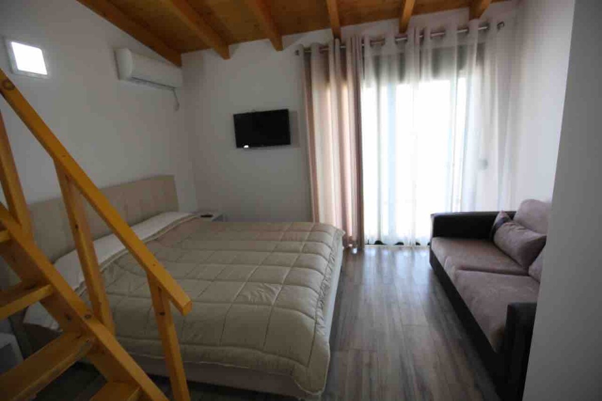 Está ubicado en el segundo piso de nuestra casa y tiene una entrada privada, wifi y una vista de 180 grados del mar Jónico. Dado que puedes llegar tanto al centro de Himare como a las playas a pie, esta es la estancia perfecta si quieres aparcar tu coche de forma segura y pasear.