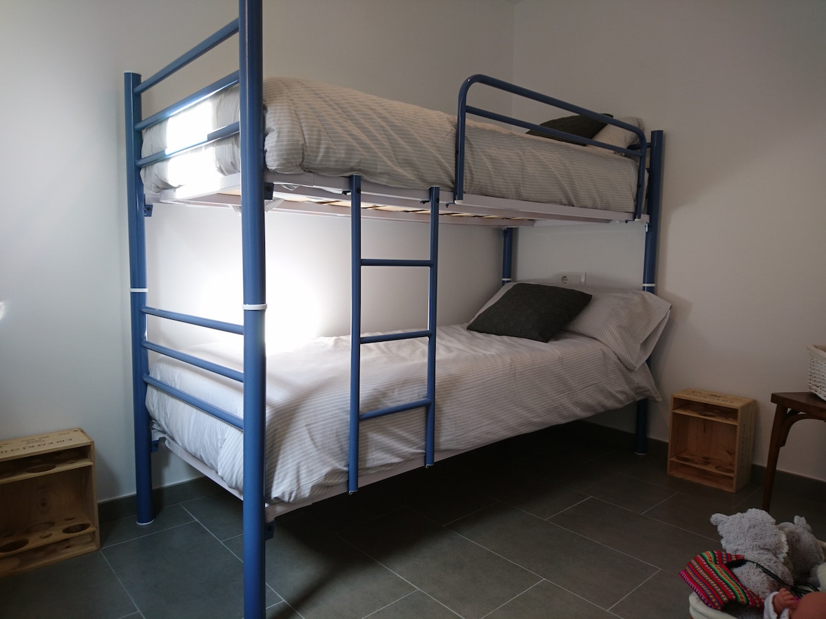 Está situado en medio del pueblo, a la altura de la plaza, a unos 2 minutos a pie, donde hay un supermercado, quiosco y algunos bares, en una zona sin ruidos por la noche. El apartamento tiene mucha luz y dispone de un amplio patio/terraza donde se puede comer al aire libre, relajarse y los niños pueden jugar. Hay una cama de matrimonio, una litera y un sofá cama muy cómodo en el comedor. Tiene todas las comodidades de una casa propia: lavadora, plancha, lavavajillas, secador, aspiradora, aire acondicionado y calefacción