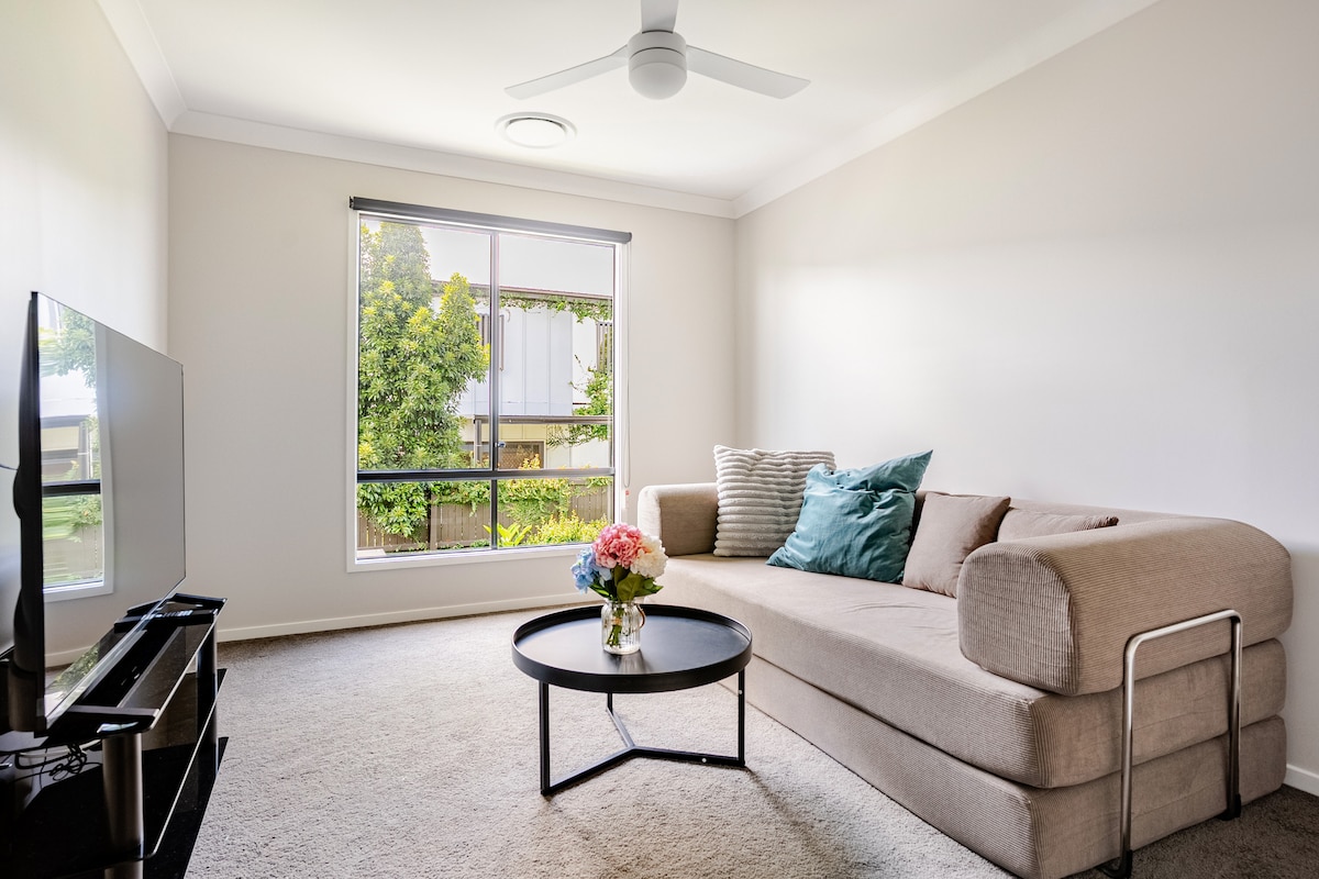 Beautiful, newly refurbished home sleeping up to four guests. Quiet, elegant, and spacious, featuring two separate bedrooms: a king master bedroom and a second bedroom with two pull-out beds for children. Includes two bathrooms (one has a lovely relaxing bathtub), a dedicated office/study, full kitchen, comfortable living area, and outdoor space. Conveniently located near swimming pools, shops, cinemas, national parks, and just a 30-minute drive to Brisbane CBD.