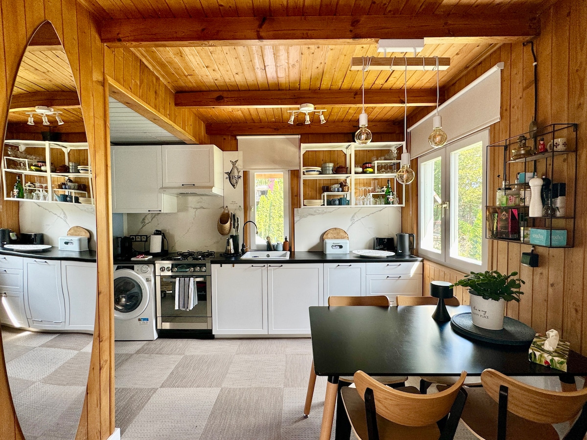 Encantadora casa de madera para una familia o un grupo de amigos, situada a solo 45 kilómetros de Varsovia (muy fácil acceso). La zona tranquila hace que sea un verdadero oasis de paz. Aquí puedes respirar aire fresco, dar un largo paseo por los bosques de los alrededores o dar un paseo en bicicleta. El interior, decorado en estilo rústico, es excepcionalmente acogedor. En verano, puedes descansar en la terraza o en una hamaca, y en invierno, encender un fuego en la chimenea y jugar a juegos de mesa. ¡Se admiten mascotas! ♥