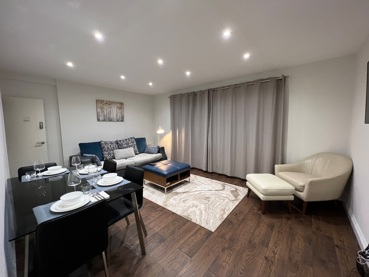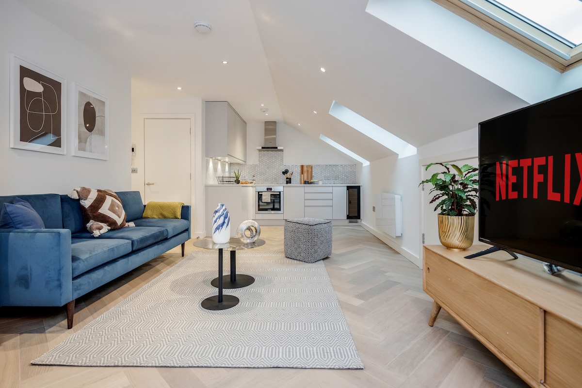 • 500 pies cuadrados 3er piso 1 dormitorio/1 baño con techos altos • Apto para niños, con cuna de viaje, silla alta, puertas de seguridad y parque infantil cercano. • Camas: 1 cama de espuma Super King (180 cm de ancho), colchones de tres pisos (64 cm) y un sofá. • Limpieza profesional con sábanas de 500TC y todos los servicios imaginables. • Wifi (100 Mbps), TV inteligente, altavoz, secador de pelo, ventilador Dyson, lavadora y secadora. • Otras opciones: www.airbnb.co.uk/s/homes?host_id=1408974