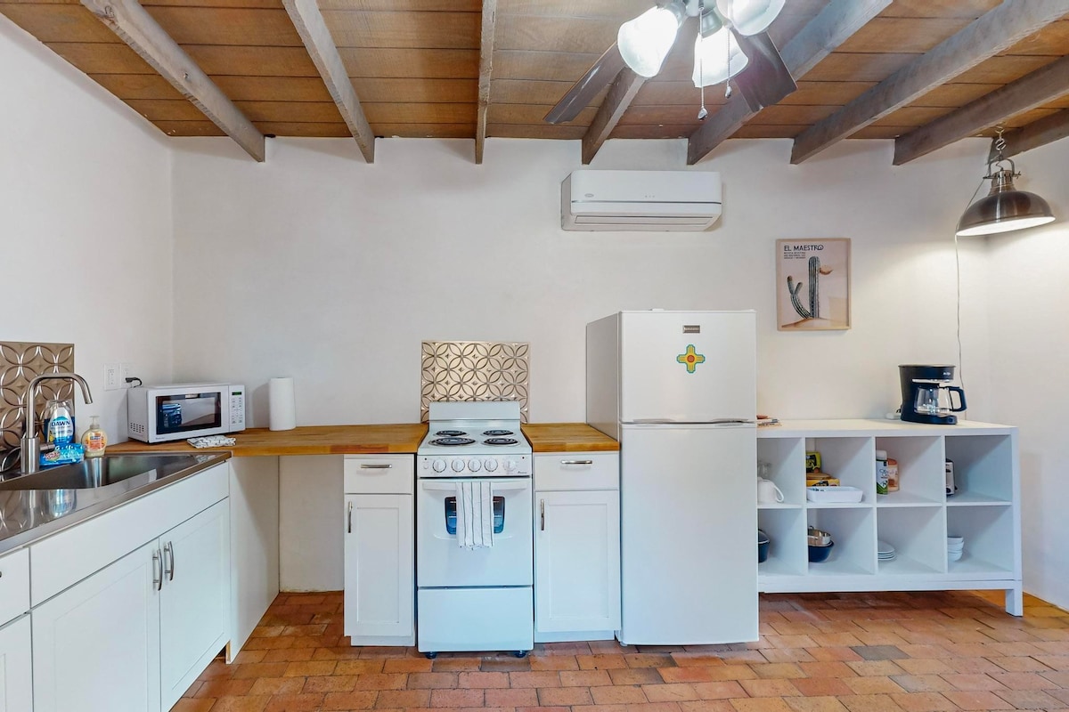 Oculta detrás de las paredes de adobe, esta casa es un clásico de Nuevo México, con pisos de ladrillo, techos de vigas y vidrieras. El gran dormitorio, que cuenta con una chimenea de gas, da a un jardín privado. Un segundo patio grande a la sombra ofrece múltiples opciones para cenar al aire libre. Está a 3,5 millas del casco antiguo de Albuquerque, a 2 millas de los senderos del centro natural del Río Grande y aproximadamente a una hora de Santa Fe. Acurrúcate junto a la chimenea de gas en invierno y relájate en el patio a la sombra en verano.