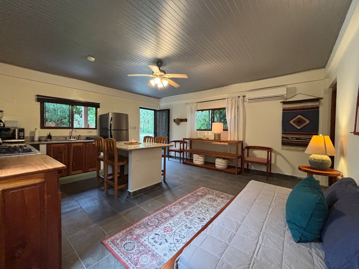 Beautiful small bungalow right on the beach with a unique location between the ocean and the river. The house comes with a private kitchenette and bathroom and a nice terrace at the front. A ladder leads up to the comfortable queen size loft bed which offers a beautiful view into the surrounding palmtrees and the sunrise over the ocean. For those who need to work, there is Starlink internet available.