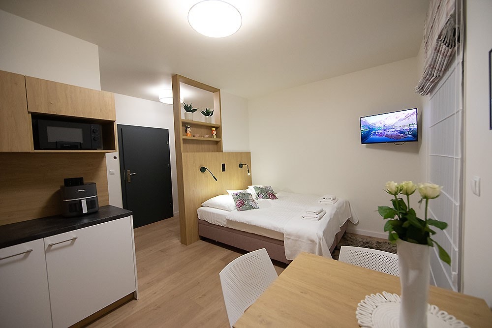 Ofrecemos en alquiler un apartamento de diseño nuevo con vistas a la pista de esquí. El apartamento se encuentra a 200 m de la parada del teleférico que le llevará a la montaña Slamník, donde podrá visitar el Sendero en las nubes y el puente colgante más largo del mundo, el Sky Bridge. El apartamento está situado en el cuarto piso, en la planta baja del edificio hay un almacén de esquís, que está equipado con un secador de botas de esquí. En el primer sótano hay una plaza de garaje para el apartamento. Al alcance del apartamento hay restaurantes y un centro de bienestar en el hotel Vista.