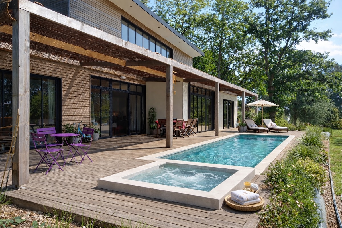 Alojamiento de gama alta con balneoterapia y sauna – Bruz, cerca de Rennes Disfrute de un paréntesis relajante en este magnífico alojamiento contemporáneo de 60 m² para dos personas Todo confort: • Cocina moderna totalmente equipada • Suite con cama King Size (180x200), ropa de cama de alta gama • Baño con bañera de hidromasaje, sauna y ducha a ras de suelo • Dos televisores conectados • Entrada con armario • Terraza y jardín Se proporciona toda la ropa de cama (toallas, albornoces ...)