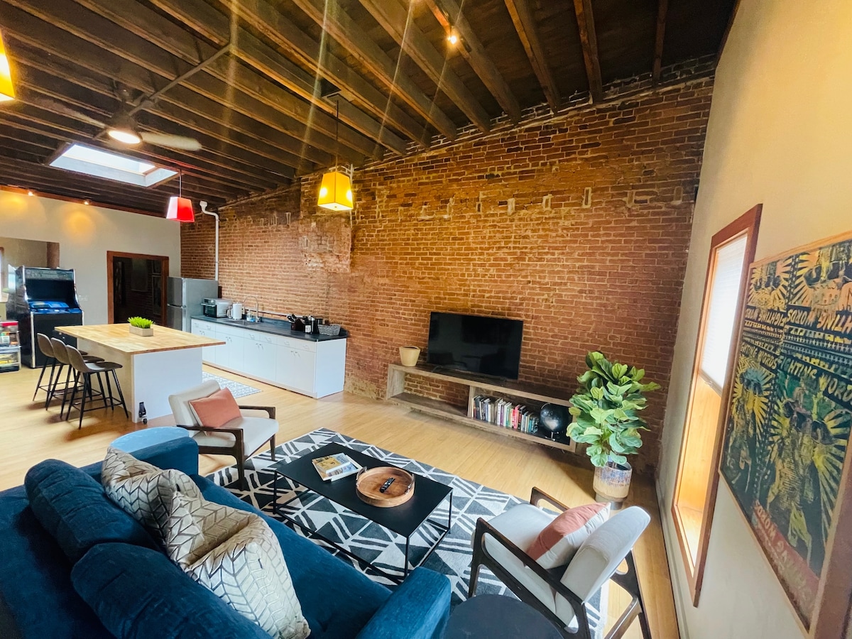 Vive la vida urbana de la ciudad en este loft céntrico diseñado con toneladas de arte local y muebles hechos a medida. Nuestro loft tiene una planta abierta con techos altos y ladrillo a la vista. Diviértete jugando en nuestra sala de juegos retro de tamaño completo y en la máquina tragamonedas. Y cuando estés listo para dormir, te va a ENCANTAR el colchón Saatva. Situado justo en medio de toda la acción del centro de la ciudad, rodeado de los mejores restaurantes y actividades. Ubicado encima del restaurante Abreo, todos los huéspedes reciben un 10 % de descuento durante la estancia.