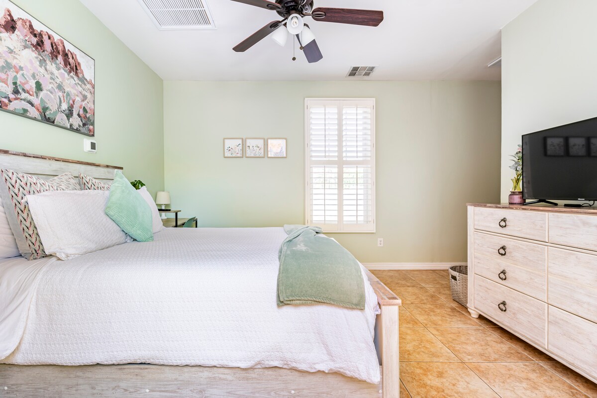 Bienvenido a la casa personalizada recién construida de AZ GO RENTALS 2022, un espacioso refugio de un solo piso de 1,500 pies cuadrados, 3 dormitorios/2 baños. Este es un edificio totalmente separado, una casa muy moderna que incluye un garaje para 2 coches y estacionamiento para 2 vehículos adicionales, ubicado en una propiedad privada de 1 acre detrás de la casa del propietario. Vas a disfrutar de una cocina elegante y abierta, duchas refrescantes, camas ultracómodas y un espacio impecable. Los huéspedes también tienen acceso a una cancha de pickleball (se requiere exención antes del check-in). Licencia: 21445829