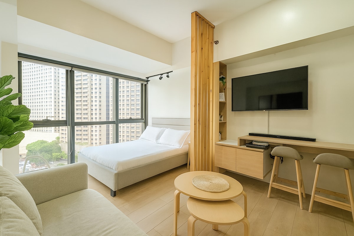1 dormitorio, diseñador, Uptown BGC, balcón con vistas, 400 MB, lavadora