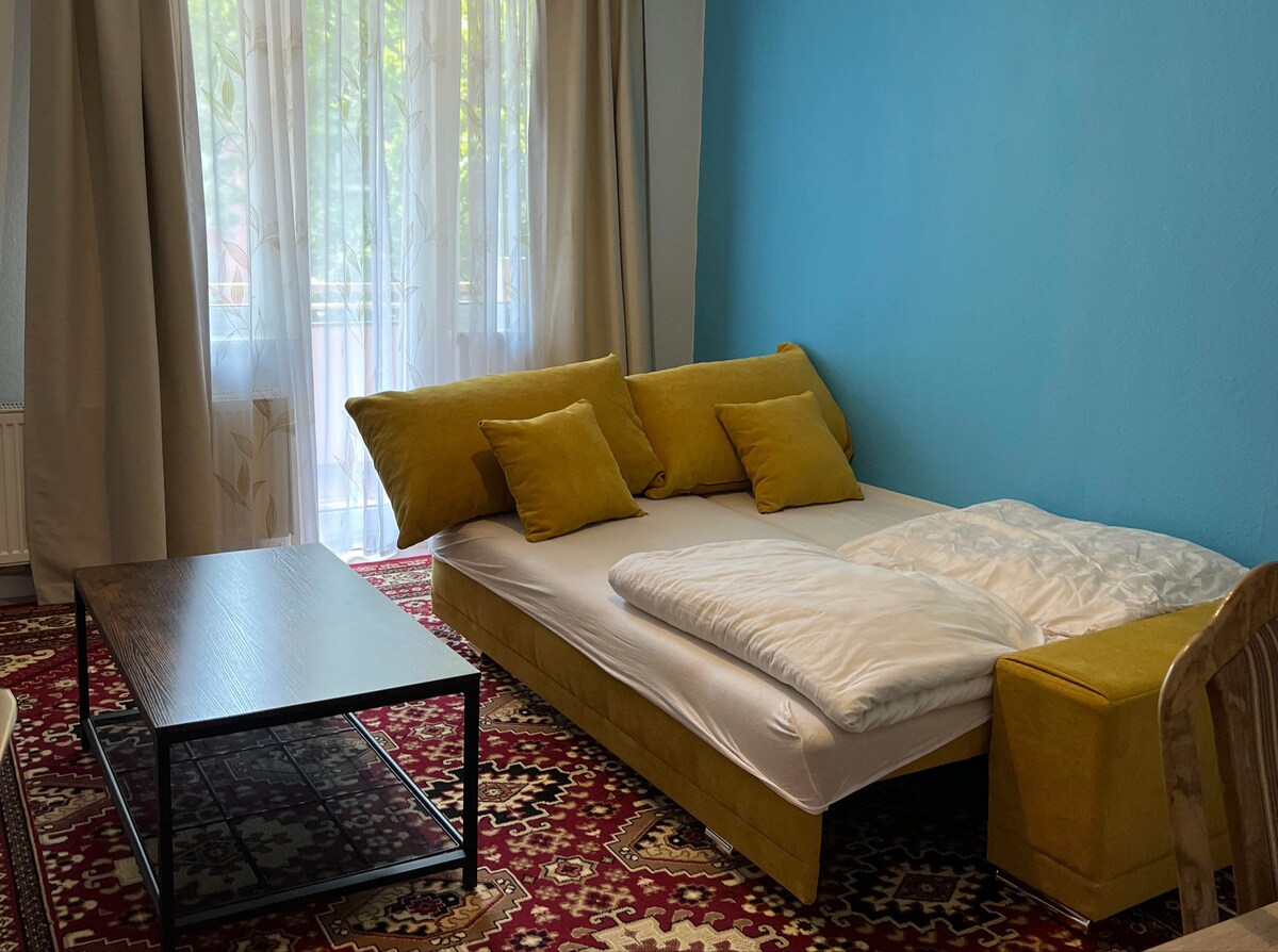Komplett neu renovierte & möblierte 22Qm/ 1 Zimmer Wohnung. Es gibt einen eigenen Zugang, zur Souterrain-Wohnung. Die Deckenhöhe ist ca 195 cm. Dazu gibt es eine kleine Küche, mit Ceranfeld, ein Spülbecken und eine Kühl/Gefrierkombi. Die Küche ist voll ausgestattet. Eine separate Toilette mit Waschbecken und Fön gehört auch zur Wohnung, sowie eine Dusche.Ein Fernseher, Kommoden, Esstisch mit 2 Stühlen dazu. Ein großes Boxspringbett gehört auch zur Ausstattung. Wir wünschen euch schöne Ferien