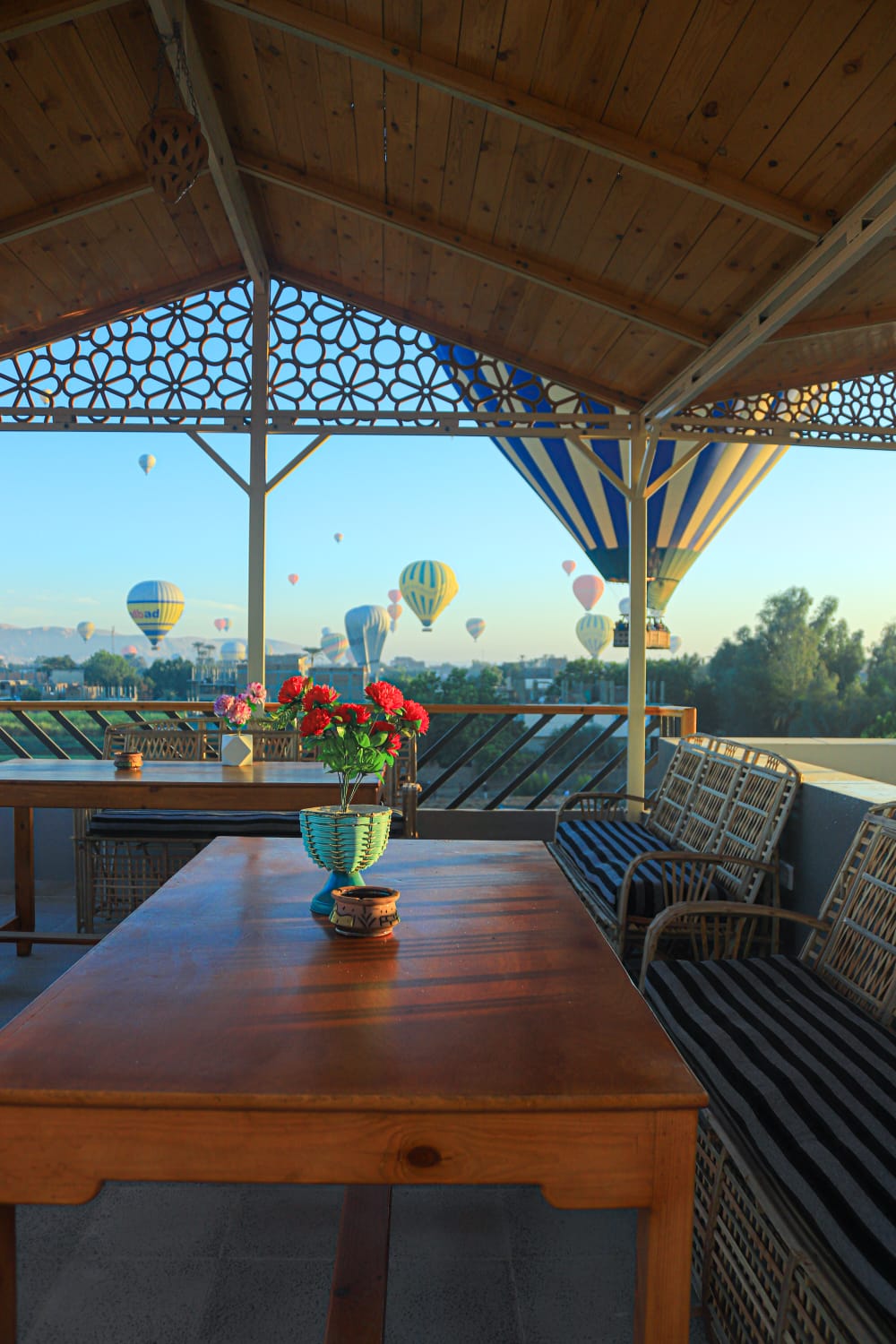 Beit El Hana is located near all the important landmarks such as the Valley of the Queens, the Valley of the Kings, and the Temple of Medinet Habu. Beit El Hana offers a beautiful view of the sunrise and sunset, and you can also enjoy hot air balloon rides in the morning. We also provide a rooftop and ideal vantage point for viewing the 2027 solar eclipse. The rooftop here will be perfect for viewing the eclipse, and there is a space here that offers a breathtaking view of the Valley of the Quee