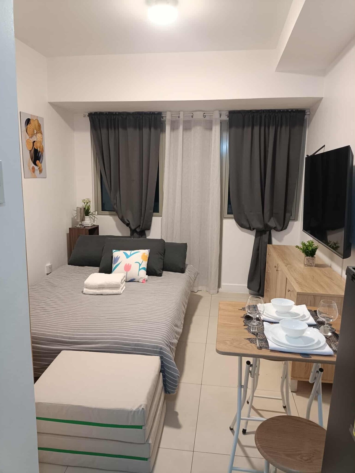 Studio unit can accommodate 4adults 1kid. 📍Acqua Residence Mandaluyong Check in&out 2:00pm/12:00pm - 1 queen size bed - 1 double size extra floor mattress - FREE use of swimming pool - FREE coffee & toiletries - FREE use of condiments - Wifi/ Smart TV with Netflix - Board games - Dining utensils - Induction cooker - Electric kettle - Microwave - Refrigerator - Rice cooker - Drinking water provided - PAY PARKING (400php + whole stay) first come first serve only
