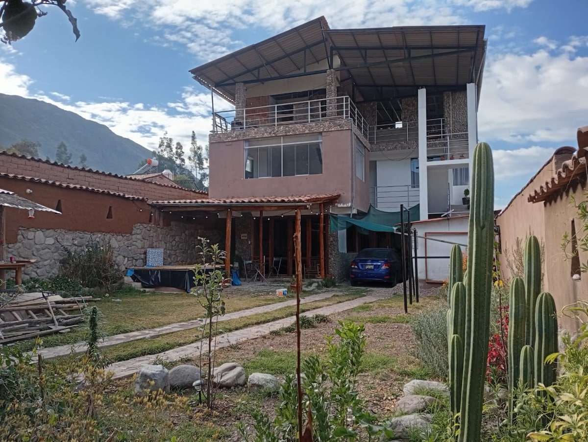Hermoza casa de campo ideal para familia de 8 y amantes de la naturaleza rodeada de vegetación arboles frutales , flores, con vista al valle sagrado con maravilloso clima zona tranquila para sentirse inmerso dentro de la naturaleza y de fácil acceso con tu vehículo. Disfruta de nuestro jacuzzy hidromasaje, parrilla al aire libre, terraza con vista a la montaña, estacionamiento y sus juegos de entretenimiento, muy buena conexion de Wifi, acceso a transporte publico.