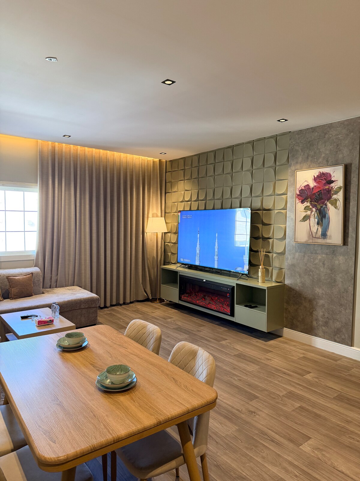 Disfruta con toda la familia en este elegante alojamiento. Apartamento moderno de lujo * Diseñado y equipado para su comodidad * Consta de dos habitaciones (master y habitación con 3 camas) Amplio salón abierto a la cocina moderna Diseño elegante (pantalla Samsung Smart WiFi) Cocina totalmente equipada - Frigorífico - Horno + microondas + lavadora - Todos los utensilios de cocina completos- - Fogones (gas/eléctricos) Además de la ubicación privilegiada A 8 minutos en coche de la estación de tren A 10 minutos en coche del aeropuerto A 5 minutos en coche de la mezquita de Quba A 15 minutos en coche de la Mezquita del Profeta