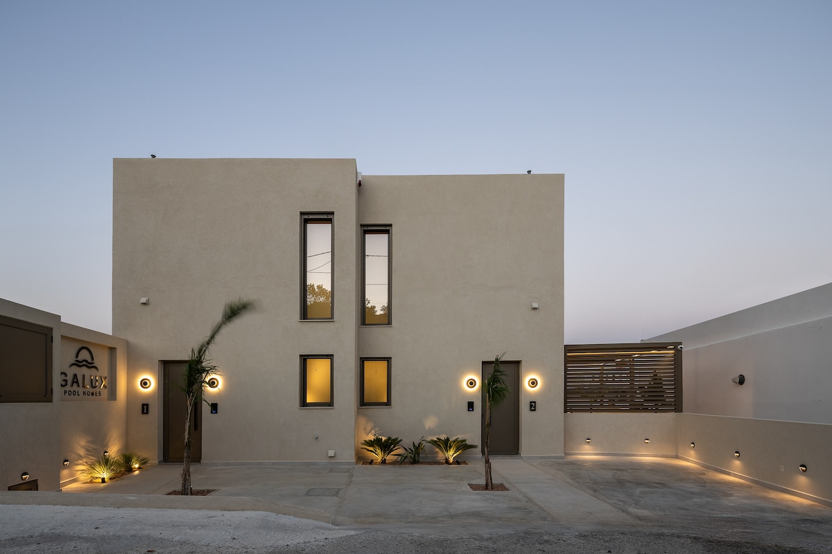 Galux Pool Homes offer the perfect blend of modern luxury and Cretan charm, nestled on the hills of Agia Galini with sweeping views of the Libyan Sea and the picturesque village below. These two private villas are thoughtfully designed for both relaxation and style. Each villa features a spacious open-plan living area on the ground floor, complete with Smart TV, air conditioning, and a fully equipped kitchen for effortless self-catering. A convenient guest WC is also located on the ground level.