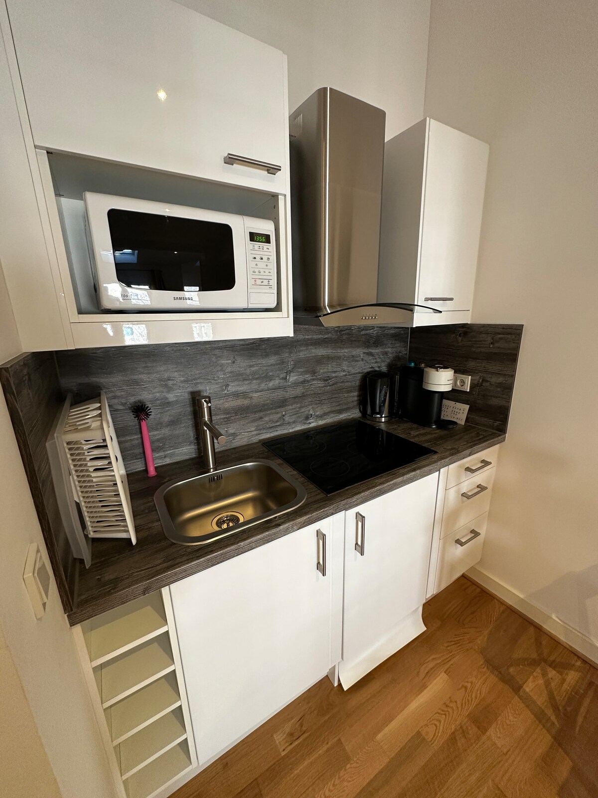 Apartamento tipo estudio en Bahnhofsviertel de Fráncfort Recién renovado, este estudio de 20 metros cuadrados consta de una cama tamaño queen, baño privado, ducha y cocina pequeña. ¿Buscas trabajar de forma remota? ¡No hay problema! Hay un pequeño espacio de trabajo con un escritorio. Este estudio tiene capacidad para dos personas.