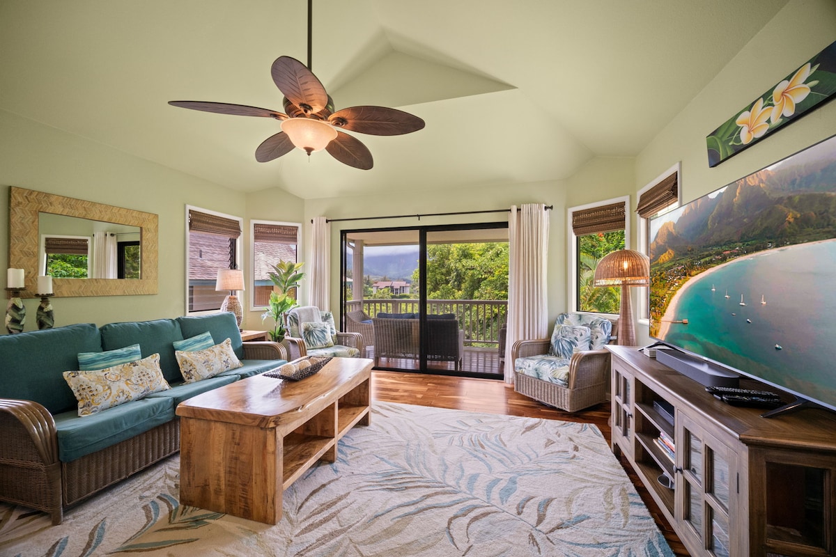 Vista panorámica al campo de golf de Princeville - Grande, tranquilo y silencioso Esta es una de las exclusivas comunidades privadas cerradas con un gerente en el lugar junto al campo de golf con impresionantes vistas panorámicas. Los techos altos abovedados, el plano de piso abierto y las grandes ventanas hacen de la villa un lugar perfecto para grupos/familias o un tamaño romántico para parejas. Con vistas inigualables al campo de golf, las montañas y las cascadas, serás transportado a la tranquilidad de tu propio paraíso privado.