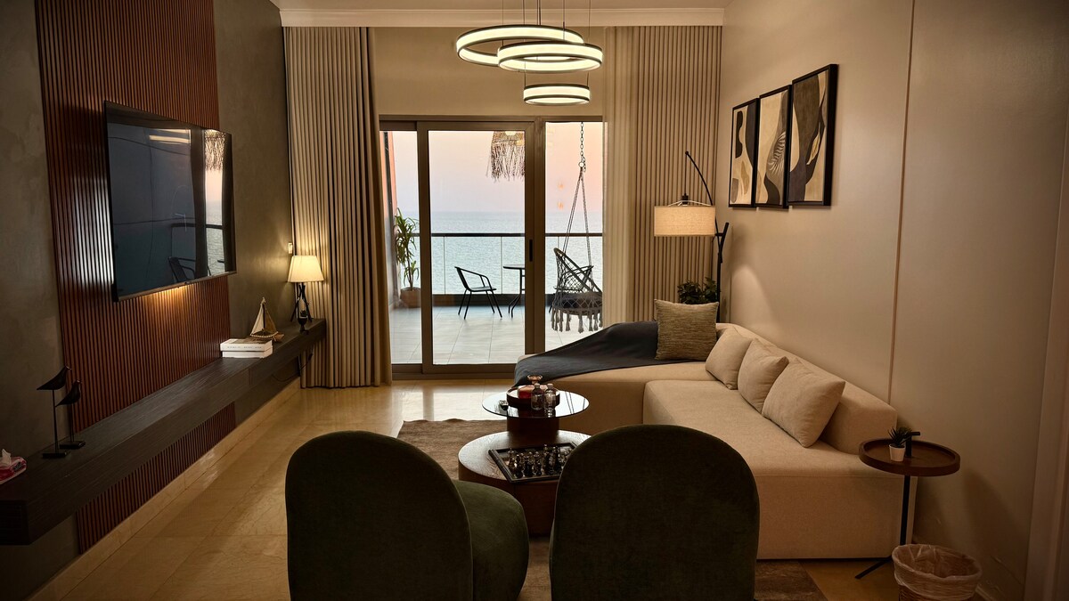 Newly furnished beach-themed apartment overlooking the ocean in the heart of KAEC city. We are right above the beachfront walk with lots of activities and restaurants nearby. Our location is a prime spot and you are bound to have a good time!