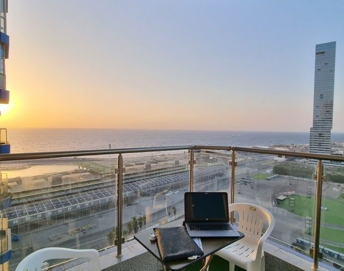 Apartamento de lujo con vistas al mar en DAMAC Jewel Tower Suscripción al fútbol⚽️🏆 disponible 🏆⚽️ - Vista completa directamente al mar abierto (balcón en el salón y balcón en el dormitorio). - Pantalla Samsung Smart de 65 pulgadas en el salón. - Pantalla inteligente Samsung en el dormitorio. - Gran jacuzzi (caliente y regular) para dos con altavoces y luces. 🛀 - Cocina completa - 2 baños. - Proporcionamos jabón, champú, herramientas de afeitar, toallas . - Luces LED controlables. - Abre Internet 5G en el departamento. - Check-in sin restricción de horario - Altavoces. 🔊